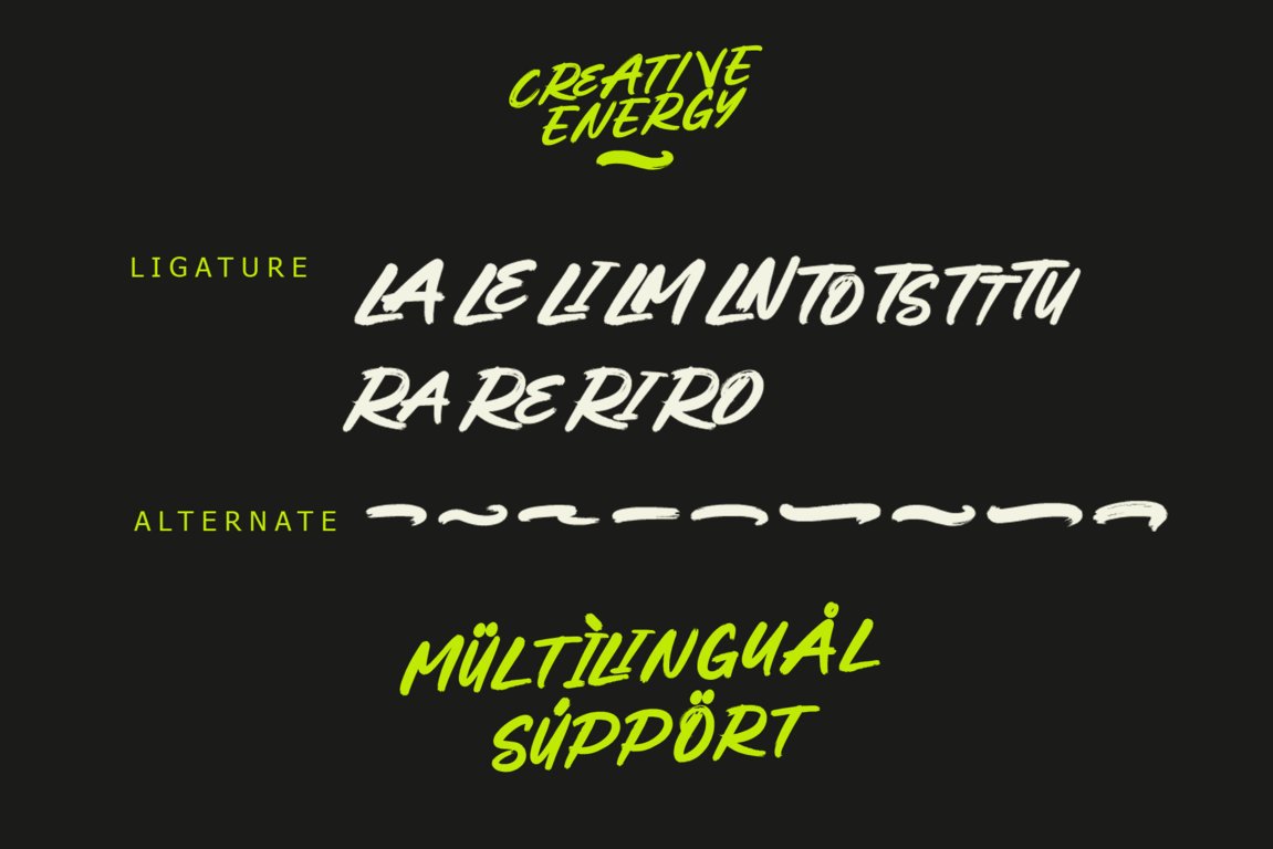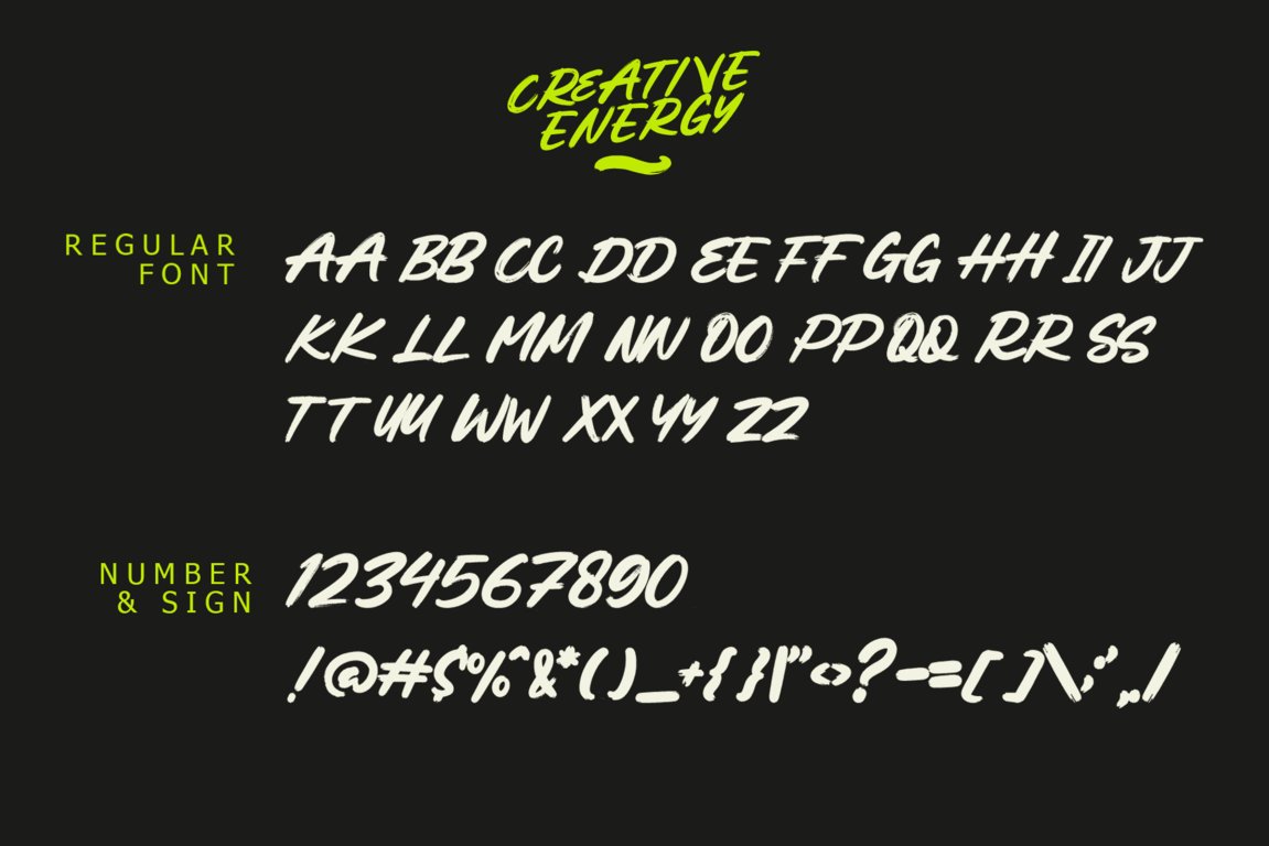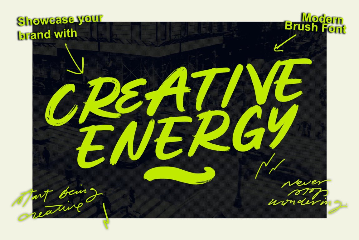 Creative Energy is a modern brush font designed to deliver powerful motion, raw expression, and bold visual impact. Inspired by energetic hand-drawn lettering and contemporary design trends, this font features dynamic strokes, textured lines, and expressive forms that instantly grab attention. Every letter feels alive—strong, confident, and full of creative momentum.