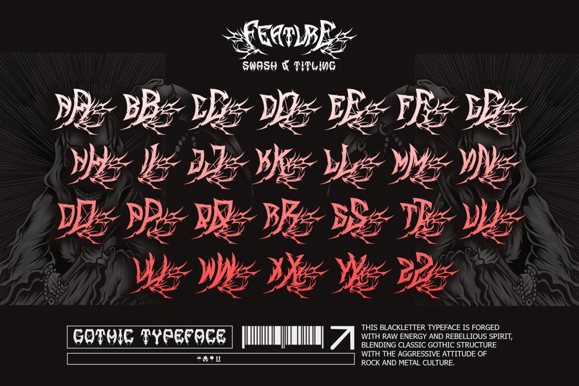Built for high-impact visuals, Demon Crown is ideal for band logos, album covers, dark fantasy titles, game branding, tattoo lettering, posters, and cinematic artwork. Every letter radiates brutality and reverence, blending gothic tradition with modern intensity to create typography that commands attention. Fully PUA encoded and packed with OpenType features, Demon Crown gives you complete creative control to craft dark, powerful, and unforgettable visual identities.