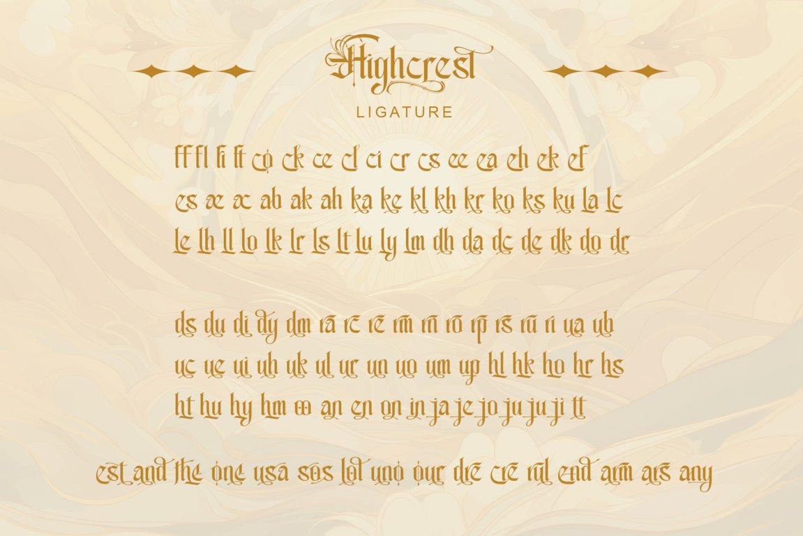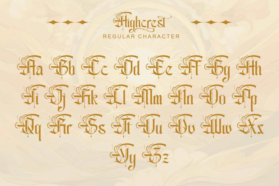 With over 430 glyphs and full multilingual support, Highcrest offers expansive creative freedom while preserving the integrity of traditional blackletter aesthetics. This is not decoration—it is a declaration. Where heritage meets dominance, and every word stands crowned in power.